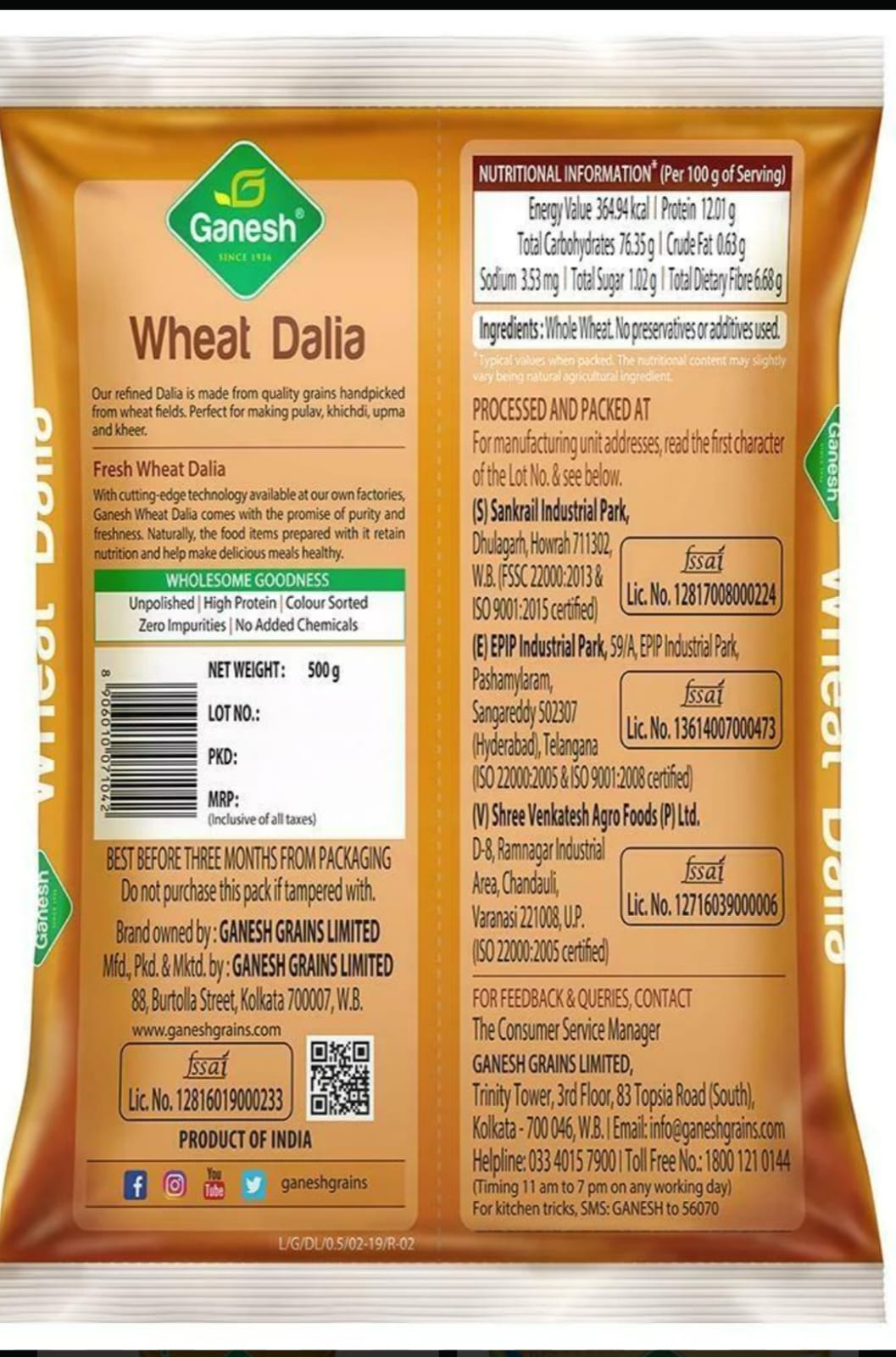Ganesh Mummy’s Own Wheat Dalia – 500gm | Fibre Rich & Chemical-Free